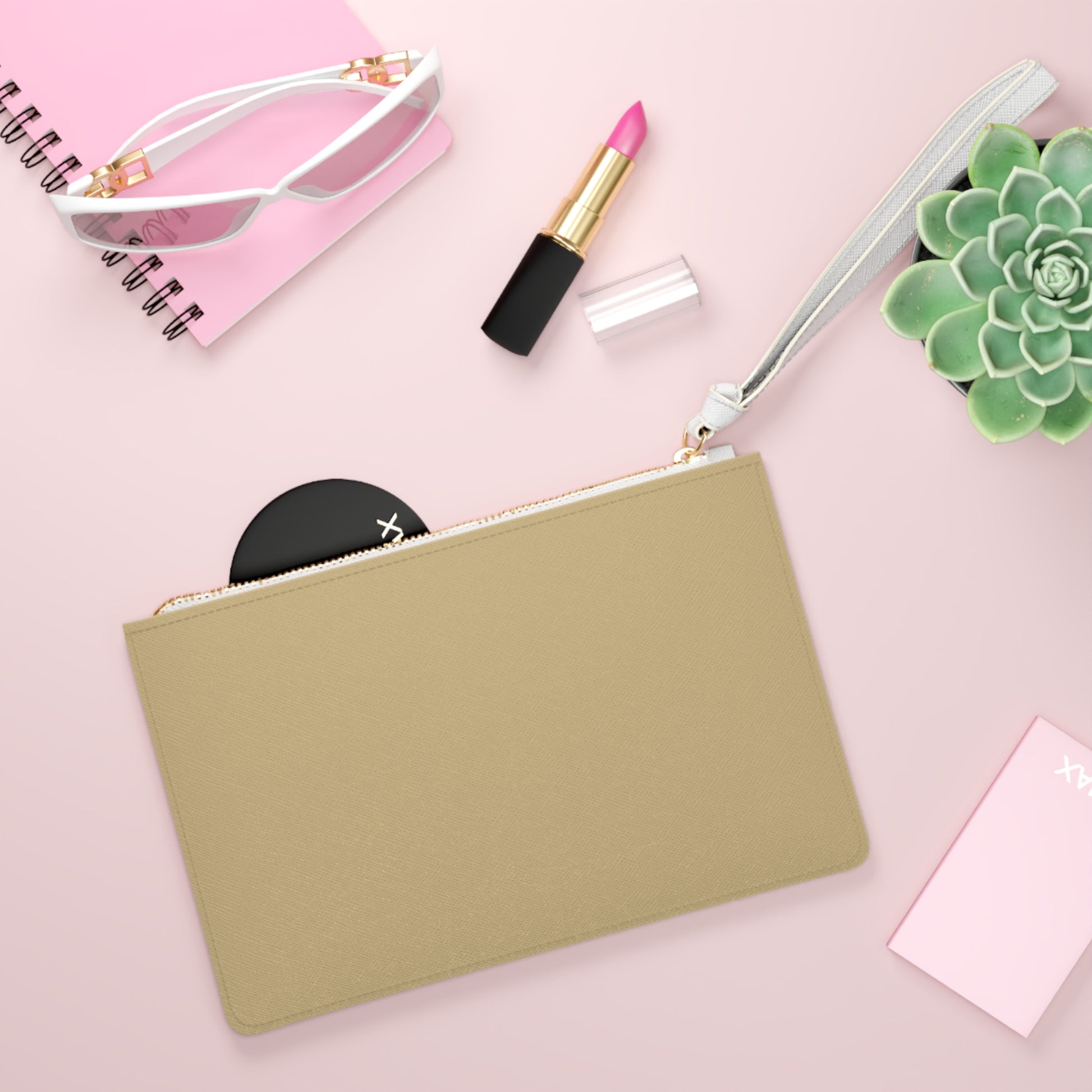 Made from vegan leather with a subtly textured finish, a smooth black lining, and a sturdy wrist strap, it’s durable yet refined. Two interior compartments — including a small pocket — help keep everything organized and close at hand.